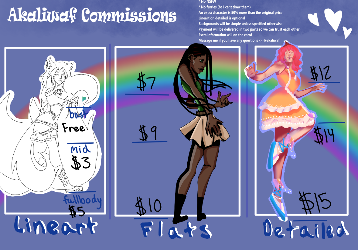 - No NSFW- No Furries (only bc I cant draw them)- If I experiment with my art style and try something new, I will check with the client to see if any changes are okay-An extra character is 50% more than the original price- Lineart on detailed is optional- Backgrounds will be simple unless specified otherwise- Gore is OKAY- My art is NOT to be used for AI purposes- I have the right to reject any order for any reason- I will NOT claim the intellectual property (IP) of the commissioned artwork (your characters are still yours, etc.)- You may NOT make profits from the commissioned piece (reselling, redistributing, uploading to POD-services, making prints for selling, etc.)